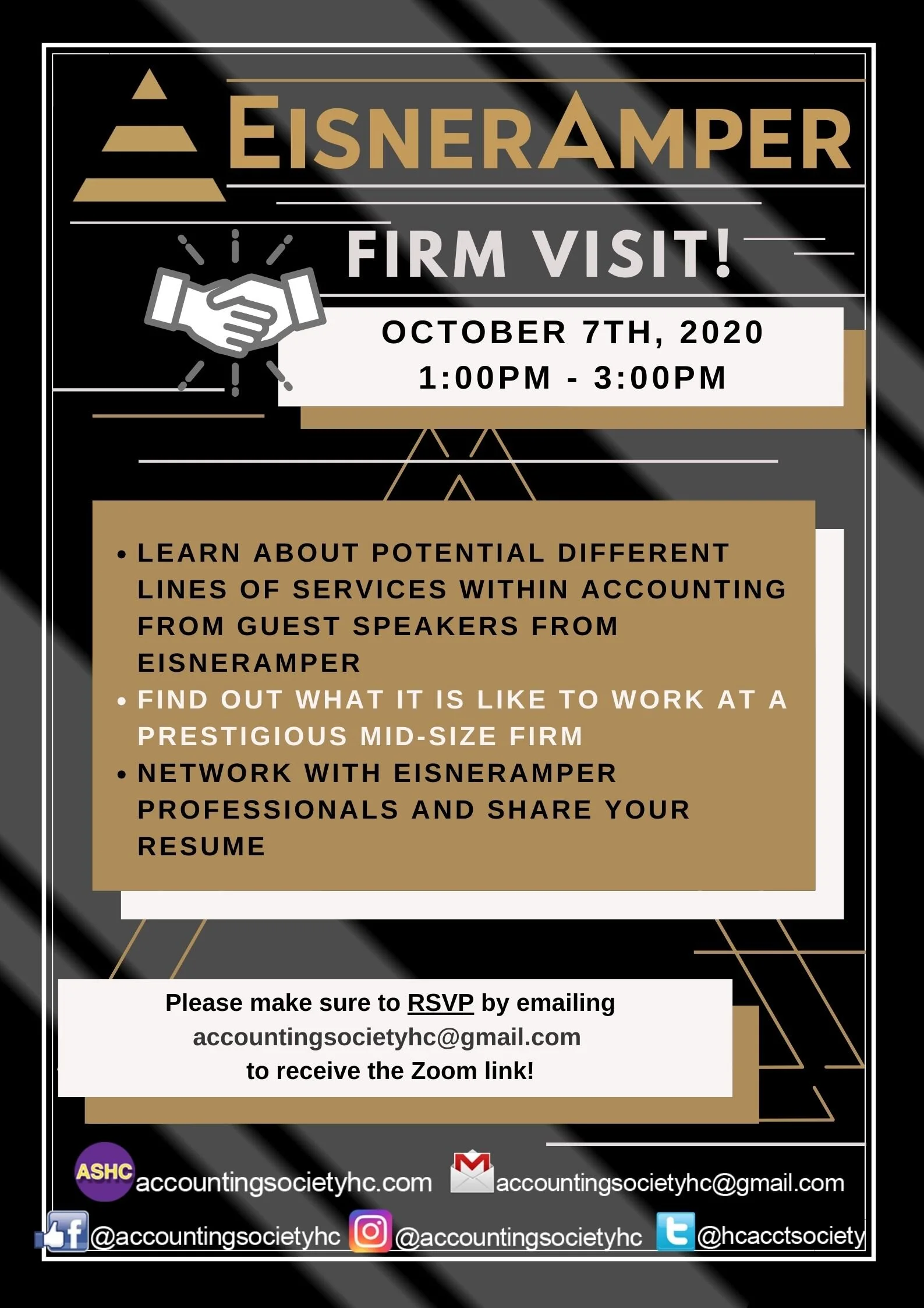 Eisner Amper Firm Visit- On Zoom Wednesday, October 7, 2020 1:00 PM 3:00 PM Google Calendar ICS Eisner Amper Firm Visit- On ZoomRepresentatives from Eisner Amper will be speaking with students about the company, how they can be recruited by the firm and what would make them an ideal candidate. View fullsize