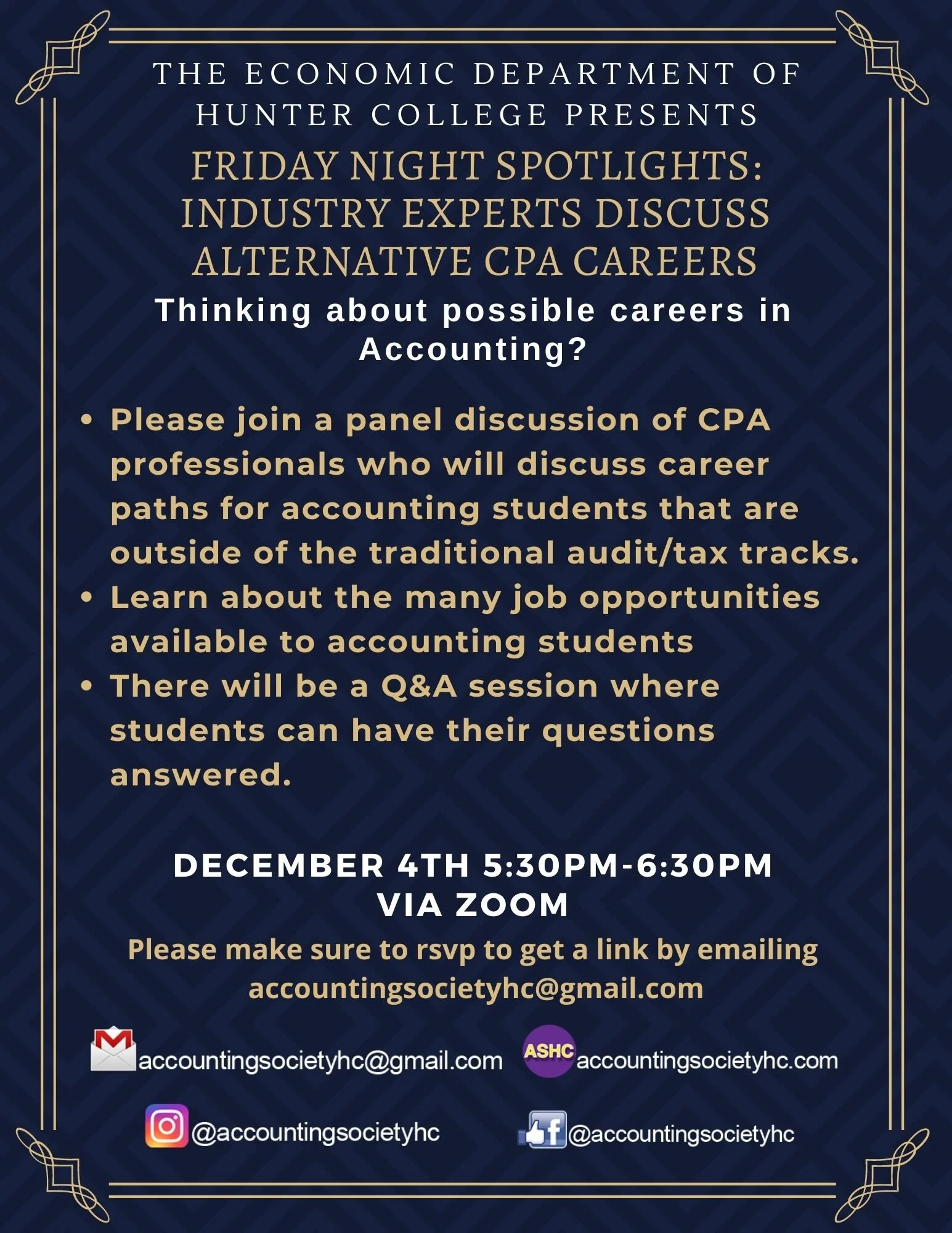 The panel of CPA Professionals will discuss their personal work experiences as well as guide students who are still deciding on career paths.