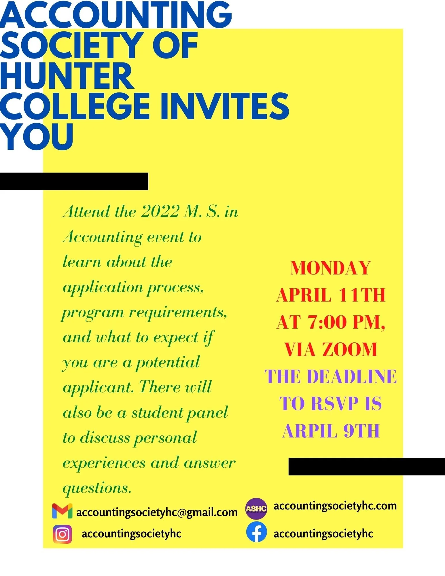 Undergraduate accounting students will get to learn about the application process for the Accounting Master’s Program and benefits of a master’s.